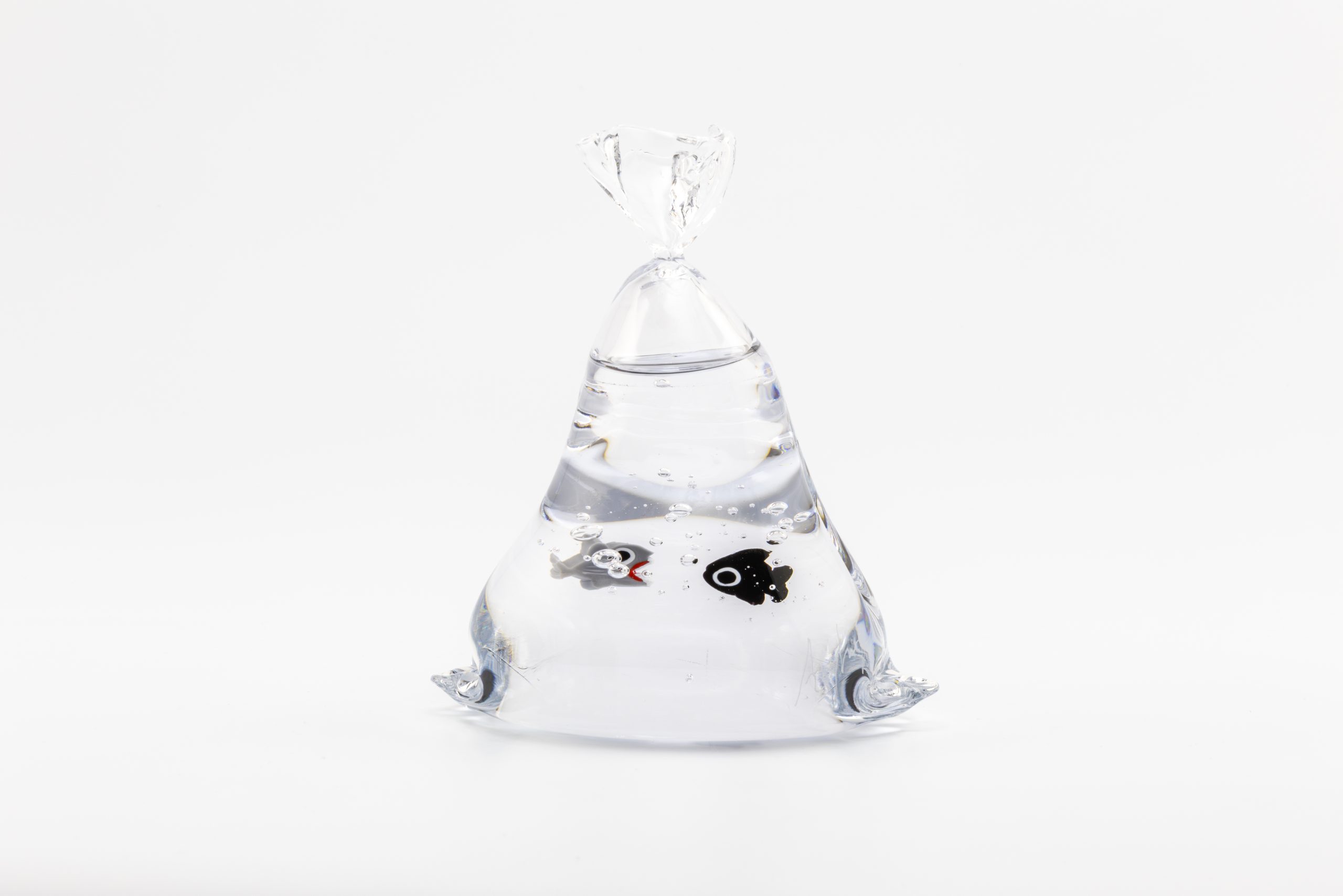 “Fiskpåse” (The Fish Bag) is an example of this. Inspired by a childhood memory of buying goldfish in a bag, Amy lets the glass mimic the movement and clarity of water.